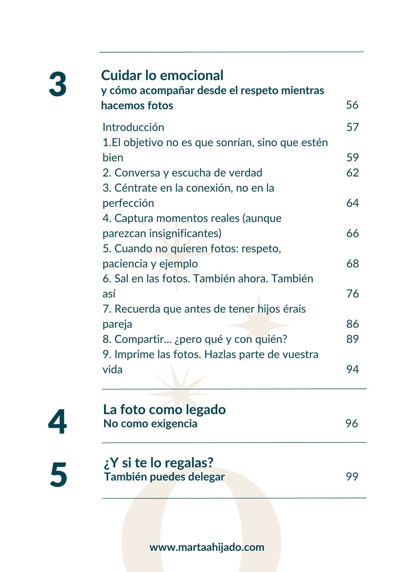 Por eso, dedico una parte extensa a la técnica —no te asustes, todo con lenguaje simple y práctico—, y otra parte al cuidado emocional, a cómo acompañar desde el respeto también cuando fotografiamos.
